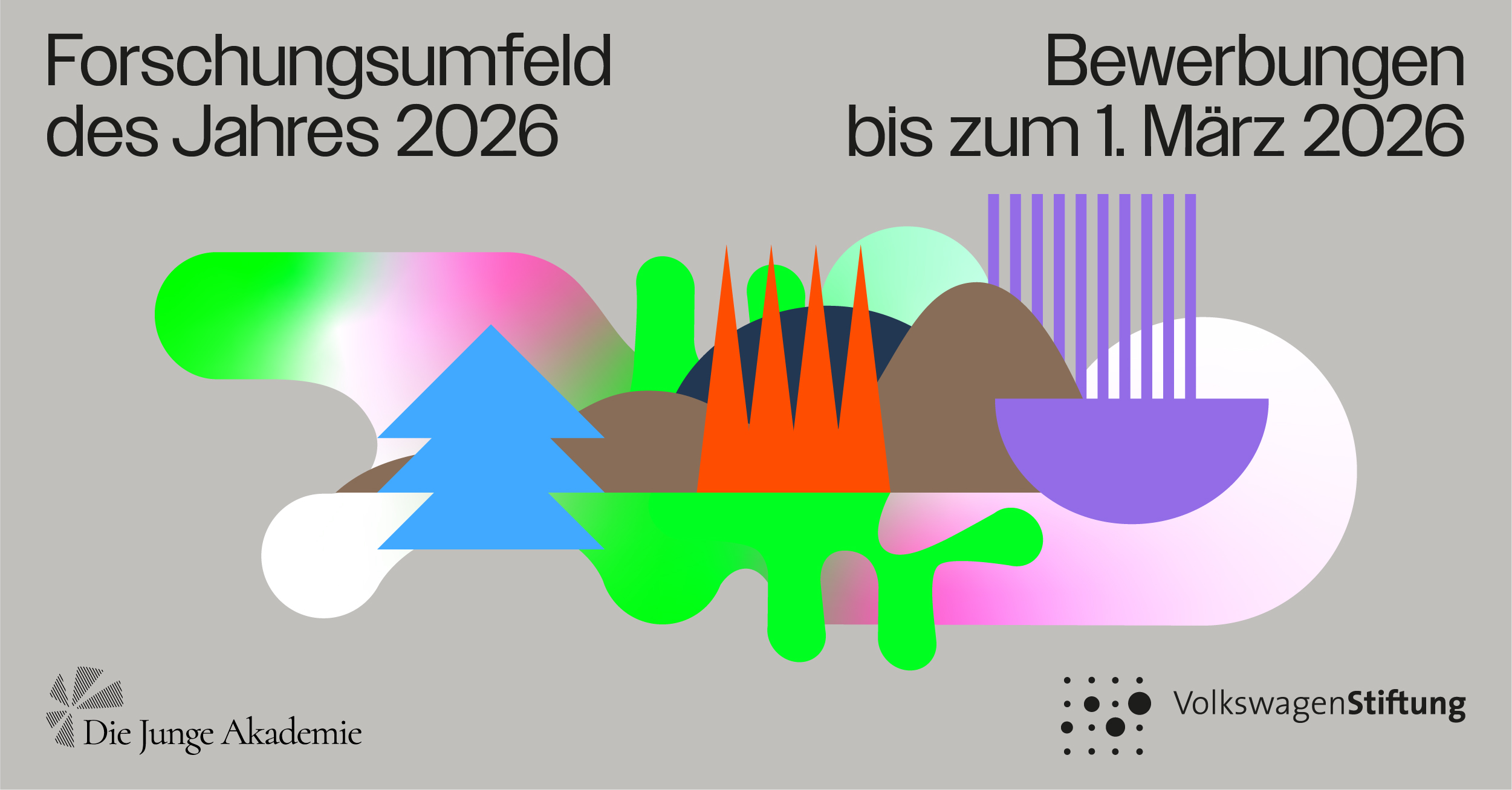 Bis zum 1. März 2026 können Mitglieder eines Forschungsumfelds, das überwiegend im deutschen Wissenschaftssystem angesiedelt ist, online unter forschungsumfeld.diejungeakademie.de eine Bewerbung für den Preis „Bestes Forschungsumfeld 2026“ einreichen. 2024 riefen die Junge Akademie und die VolkswagenStiftung diesen Wettbewerb das erste Mal aus. Der Preis betont die Bedeutung eines guten Forschungsumfelds für die Leistungsfähigkeit der Wissenschaft sowie die Wertschätzung aller beteiligten Wissenschaftler*innen. Außerdem würdigt er den Beitrag jedes Mitglieds des Forschungsumfelds für den wissenschaftlichen Fortschritt. Aus einer Shortlist werden fünf Teams ausgelost, die jeweils 10.000 Euro erhalten. Diese können zum Beispiel für Teambuildingmaßnahmen, Retreats, Coaching oder Fortbildung verwendet werden. Das Losverfahren verdeutlicht, dass es nicht um ein Ranking geht. Alle Teams auf der Shortlist sind gleichermaßen auszeichnungswürdig. Die Preisverleihung findet am 27. Juni 2026 in Berlin statt.